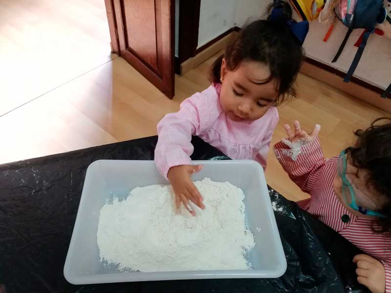 Experimentamos con harina, primero en seco y después a través de una masa elástica (añadiéndole un poco de agua).