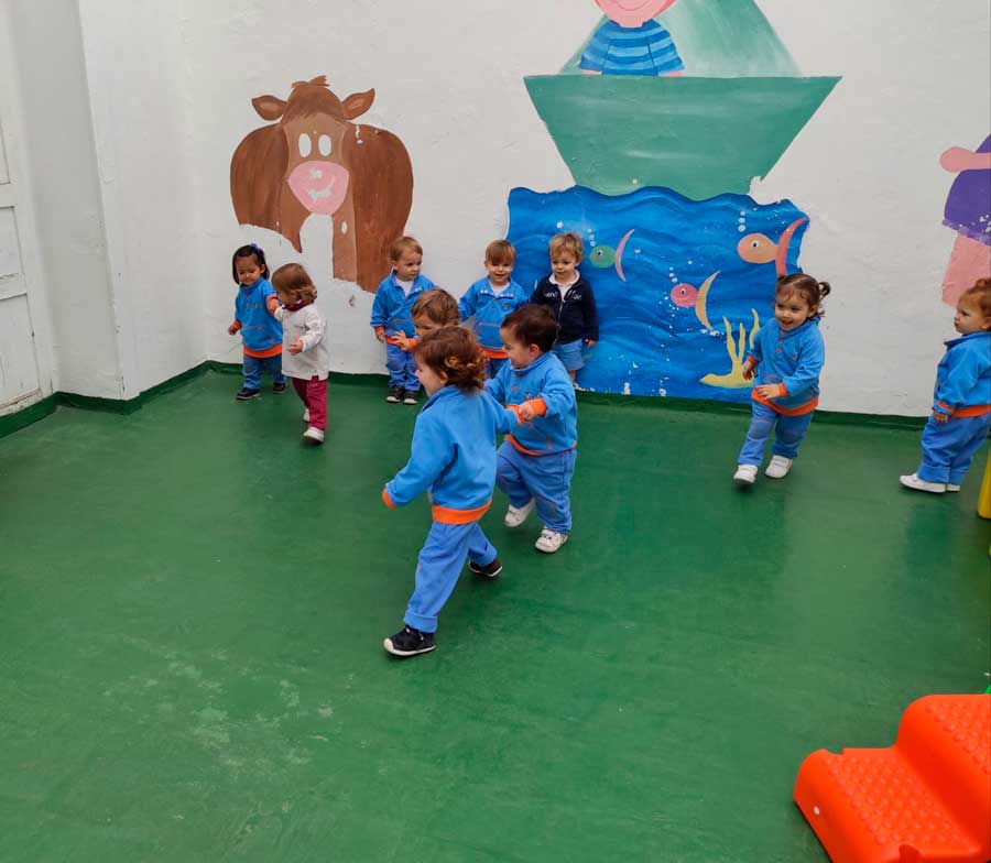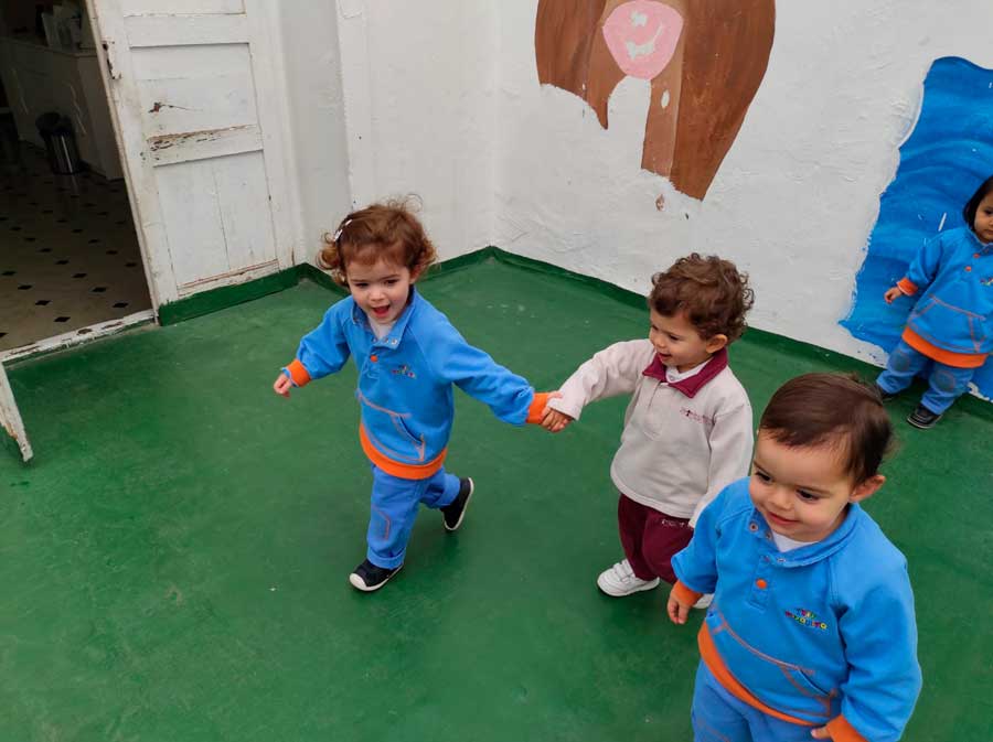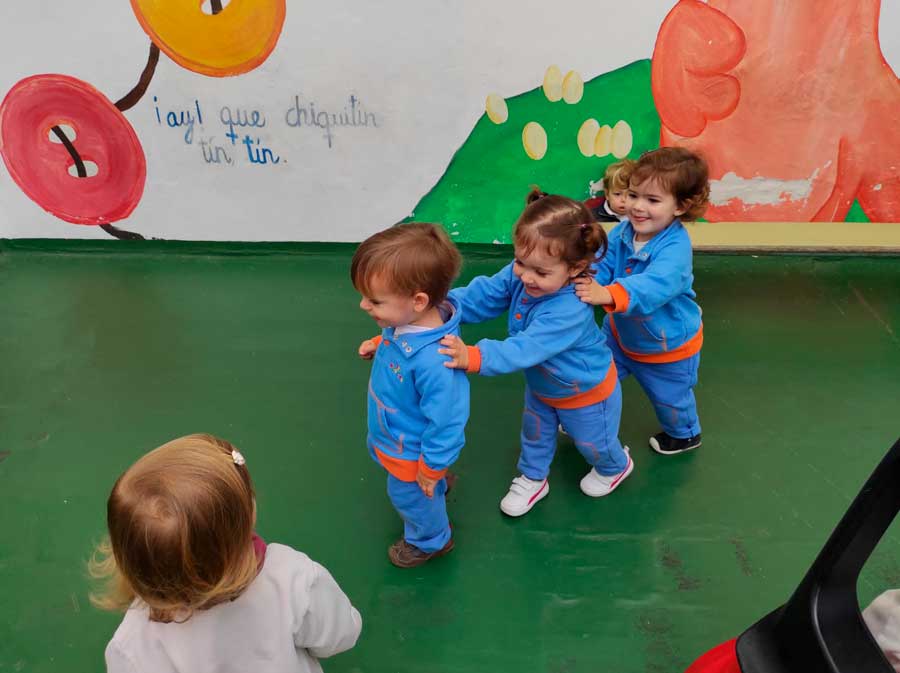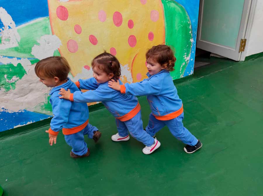 En esta ocasión, formamos cadenas y trenes para recorrer el patio, debiendo adecuarnos al movimiento de los demás, controlar nuestro cuerpo al andar o correr agarrado a alguien y permitiendo que nos dirijan o dirigir a otros con cuidado.