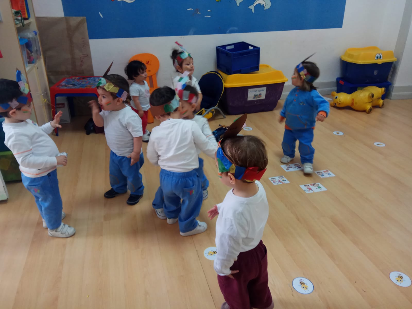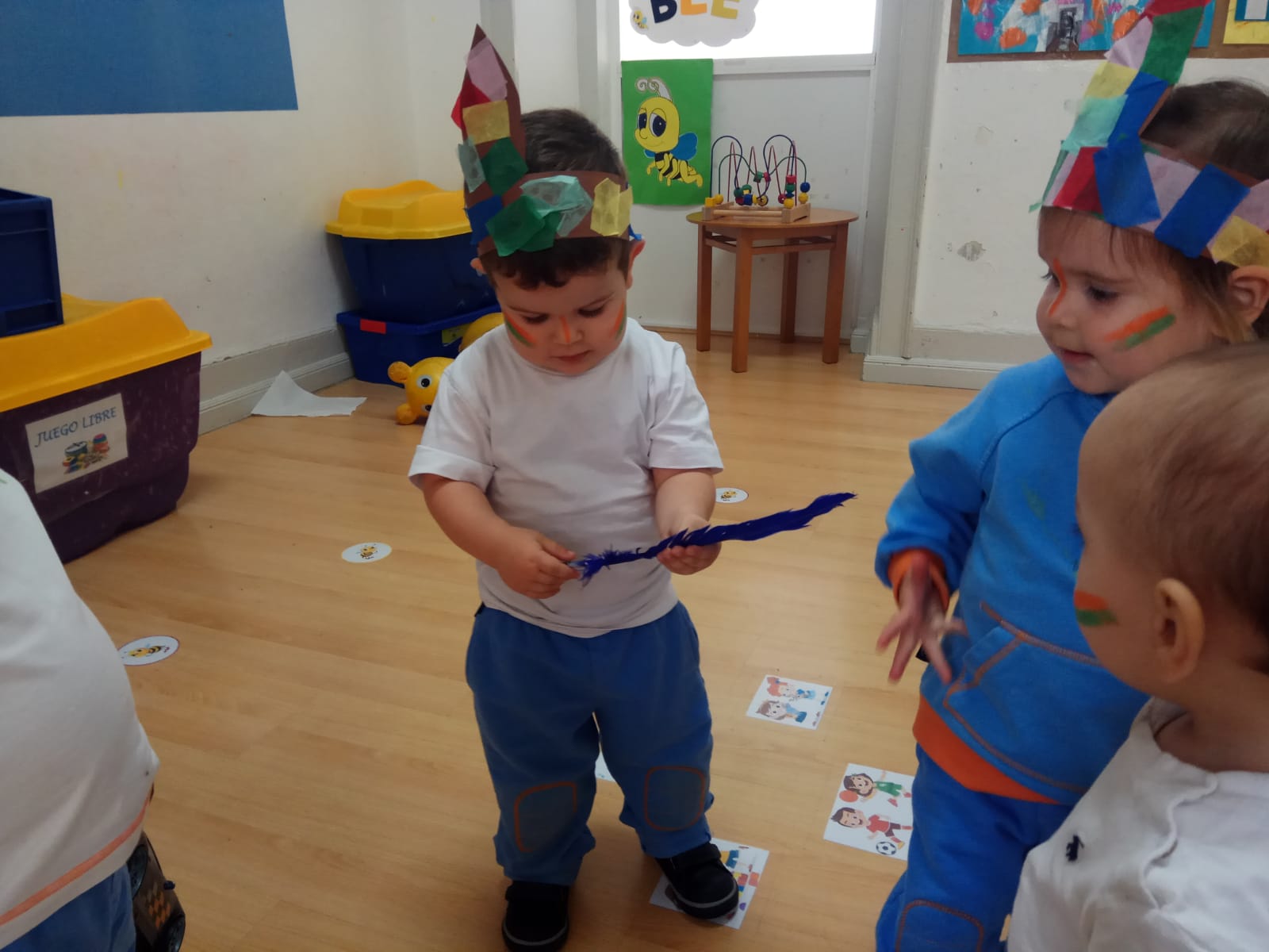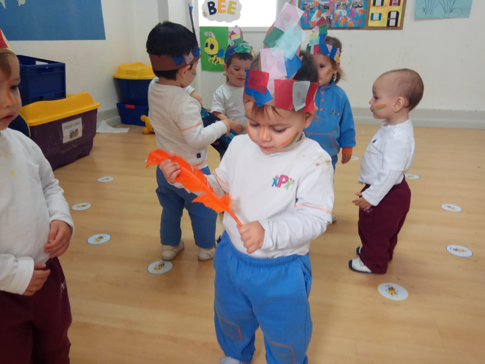 Nos pintamos la cara y nos ponemos la pluma en la que trabajamos ayer en clase. Bailamos, marchamos e imitamos su famoso grito: ¡Uooouuouououuh!