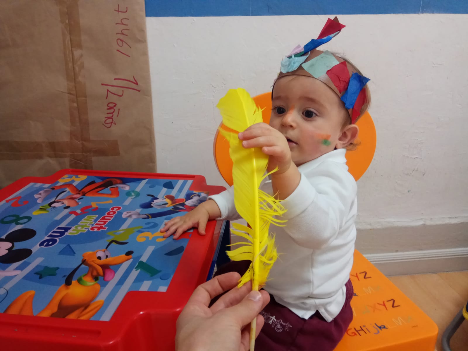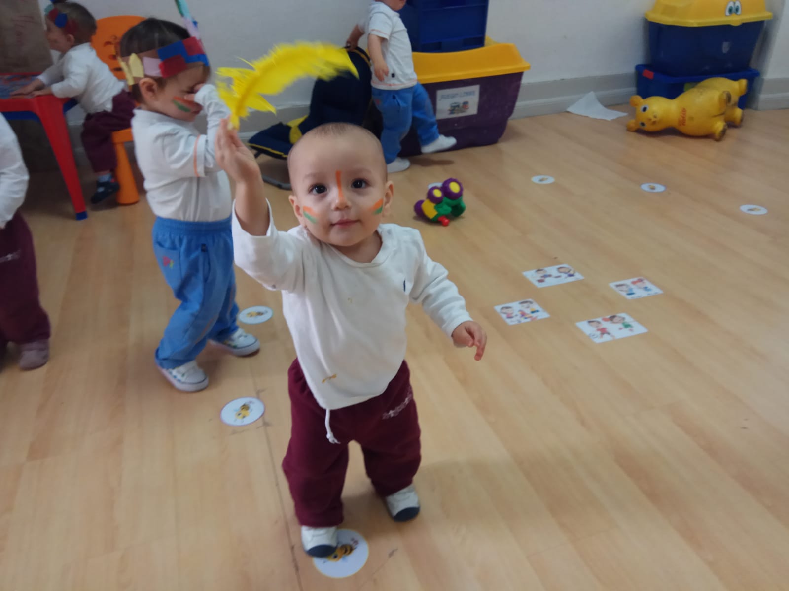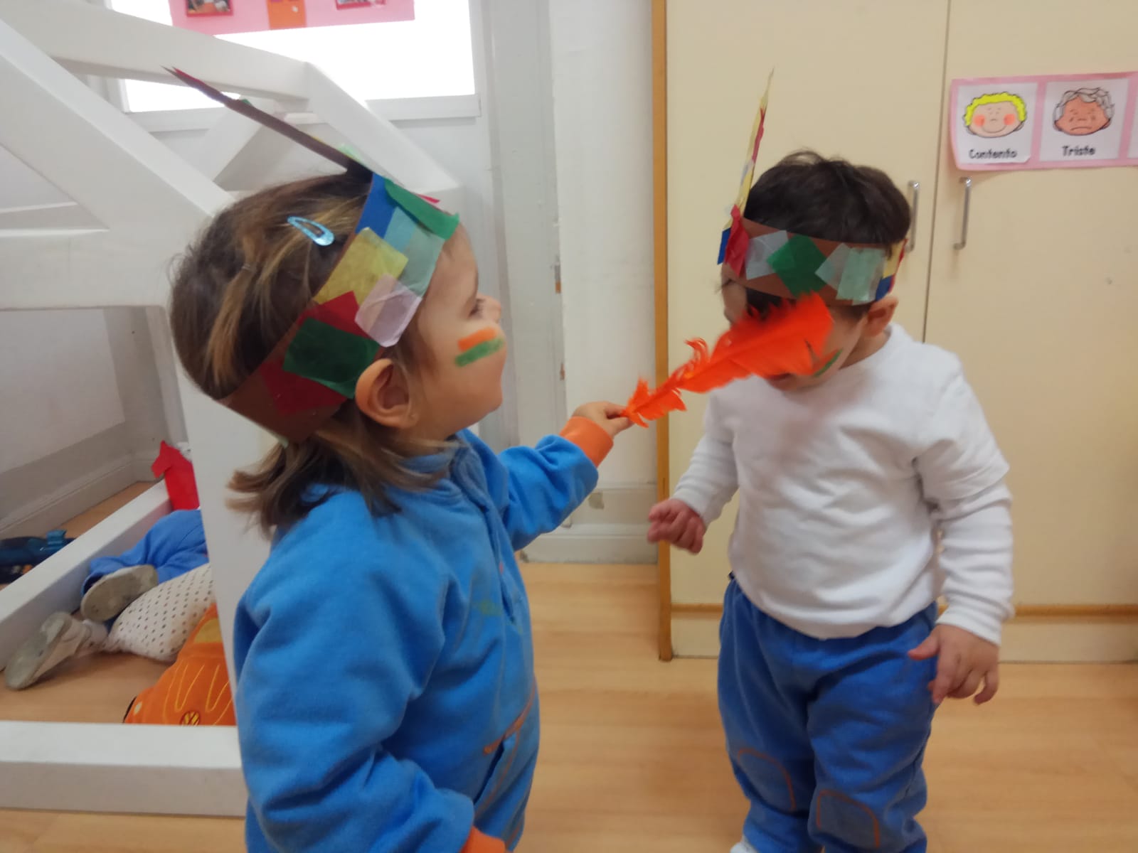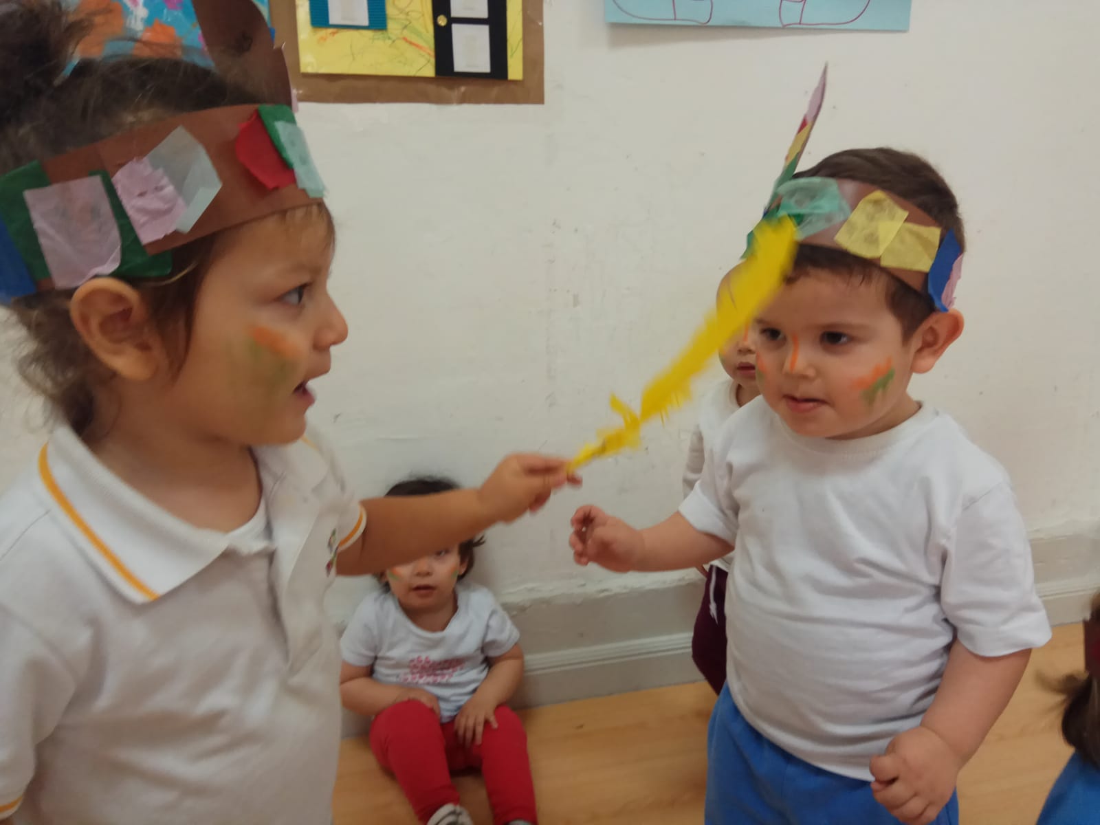 Nos pintamos la cara y nos ponemos la pluma en la que trabajamos ayer en clase. Bailamos, marchamos e imitamos su famoso grito: ¡Uooouuouououuh!